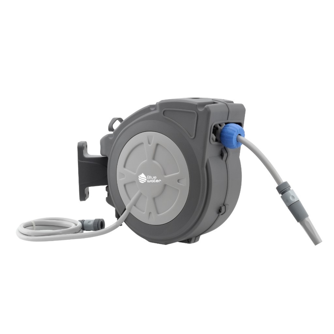 גלגלת השקיה אוטומטית מבית המותג Blue Water עם צינור השקיה באורך 20 מטר.