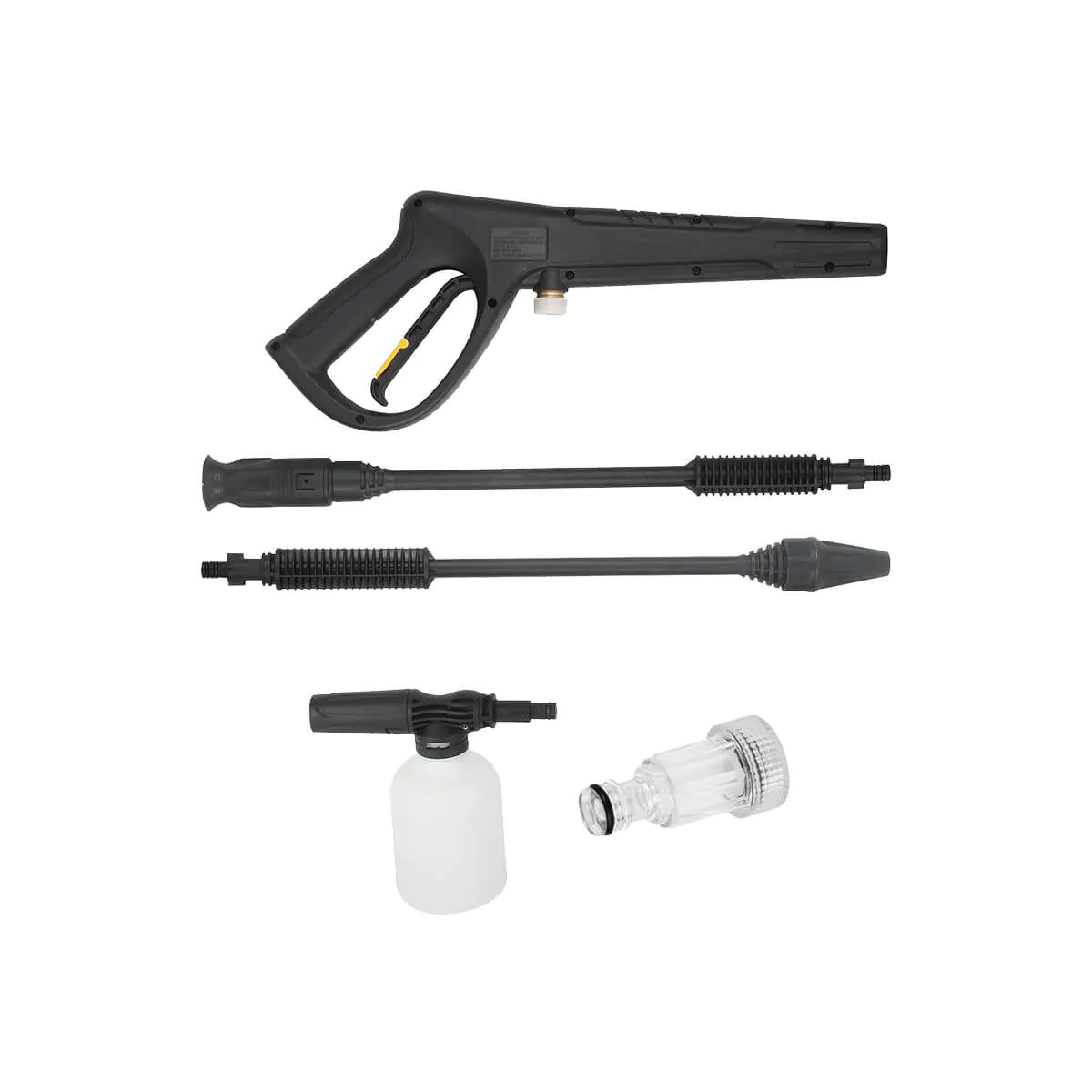 אביזרים נלווים בערכה: אקדח התזה, ציור באורך 5 מטרים, קנה התזה בעל לחץ פיזור משתנה, פיית טורבו, סנן כניסה ובקבוק ייעודי לחומר ניקוי.