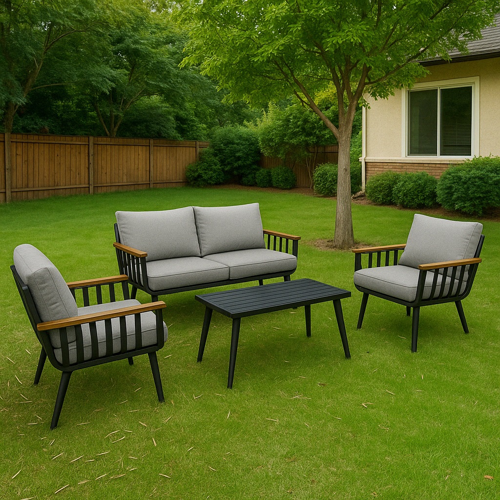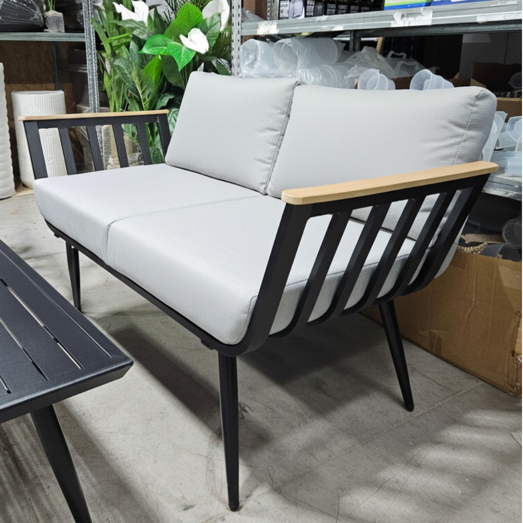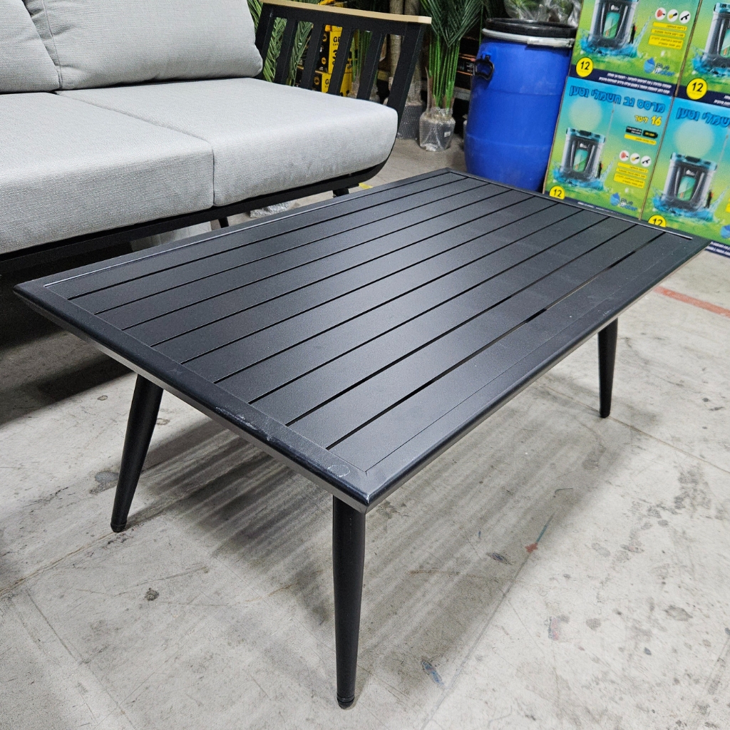 המערכת כוללת ספת זוג, שתי ספות יחיד ושולחן קפה – כולם עשויים מאלומיניום איכותי, עמיד בפני מזג האוויר וללא צורך בתחזוקה.