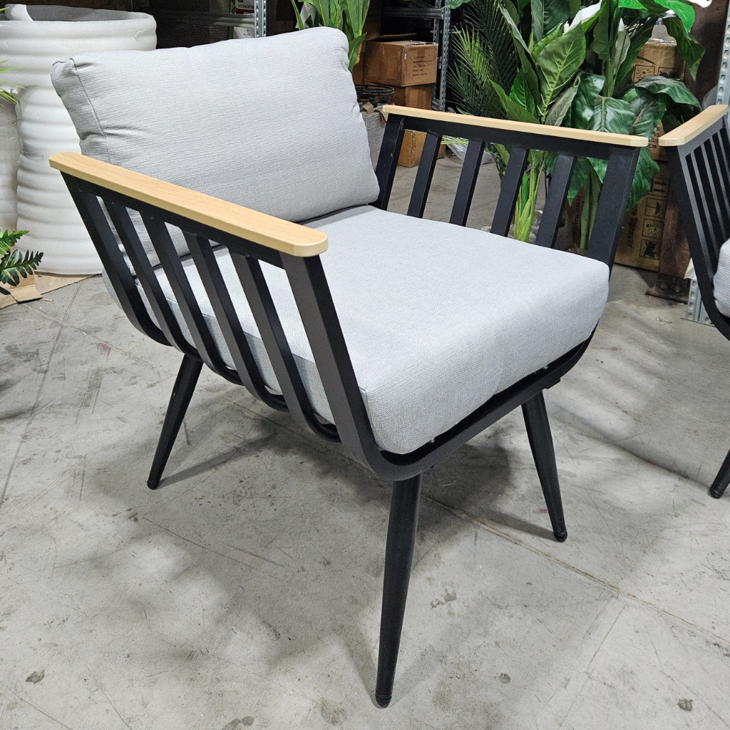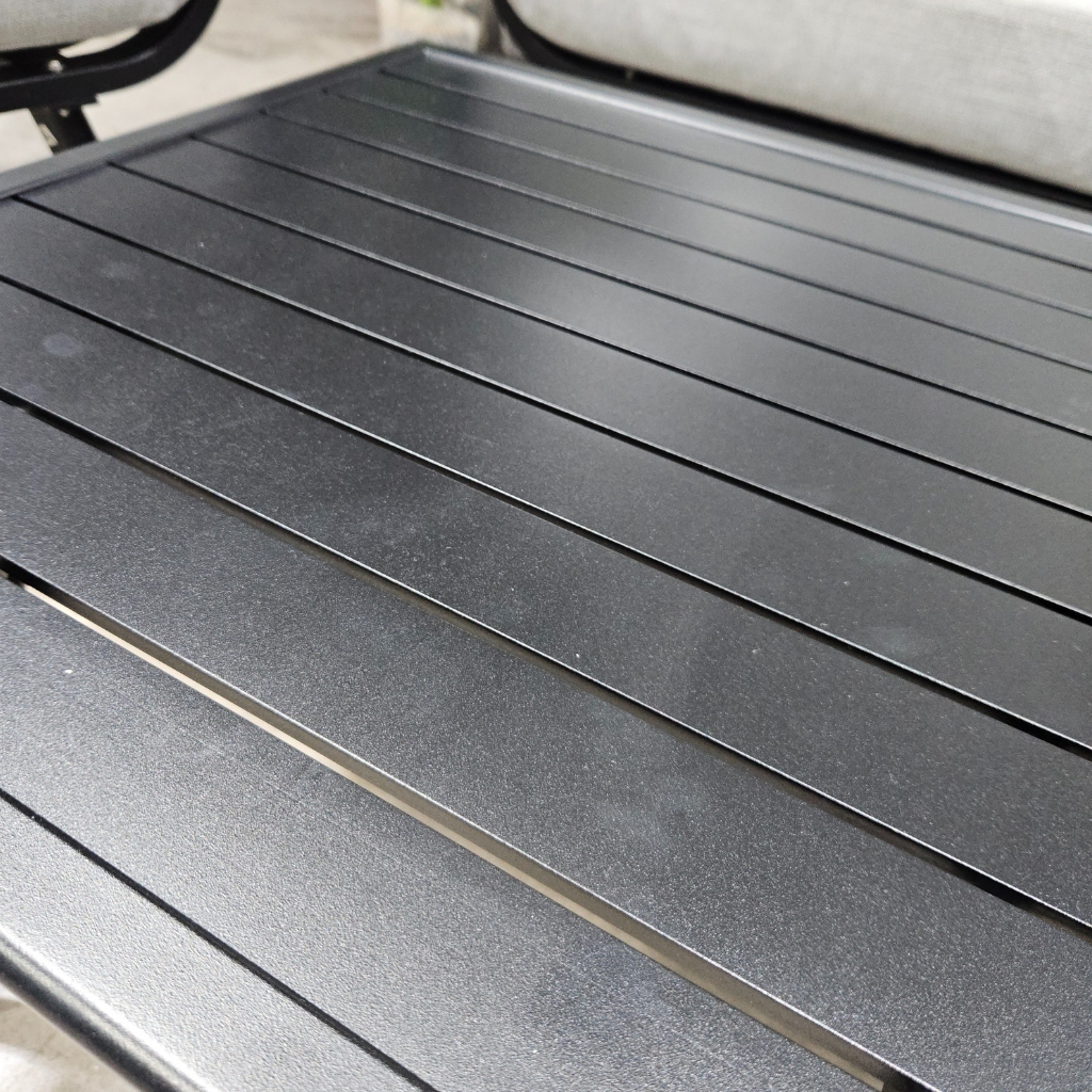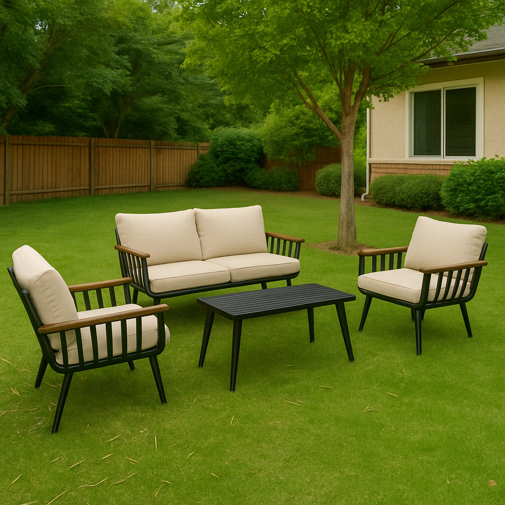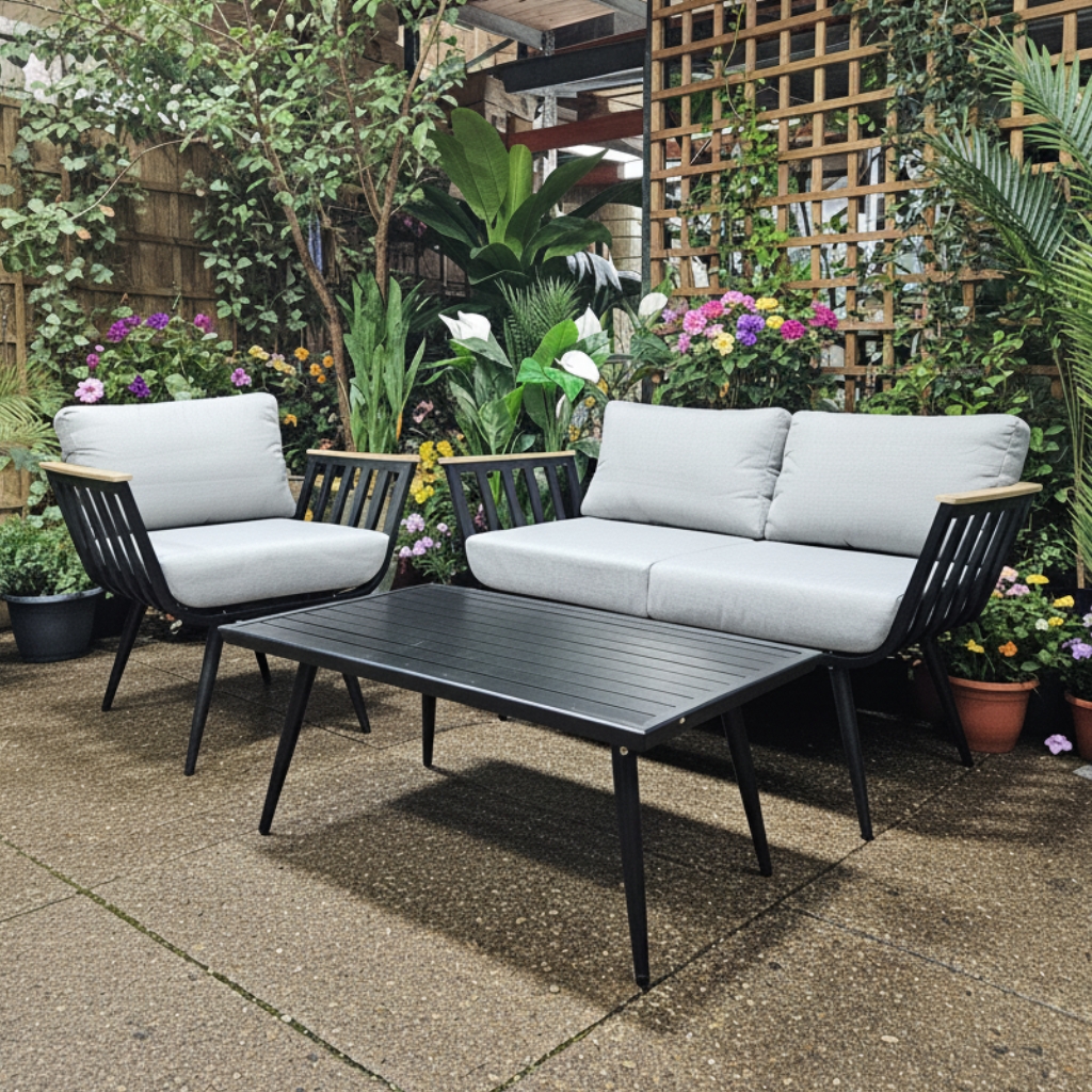 המערכת כוללת ספת זוג, שתי ספות יחיד ושולחן קפה – כולם עשויים מאלומיניום איכותי, עמיד בפני מזג האוויר וללא צורך בתחזוקה.