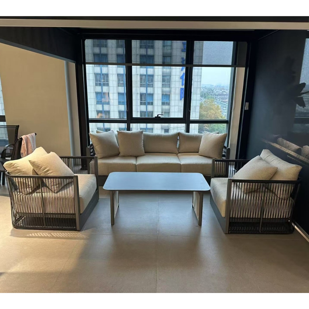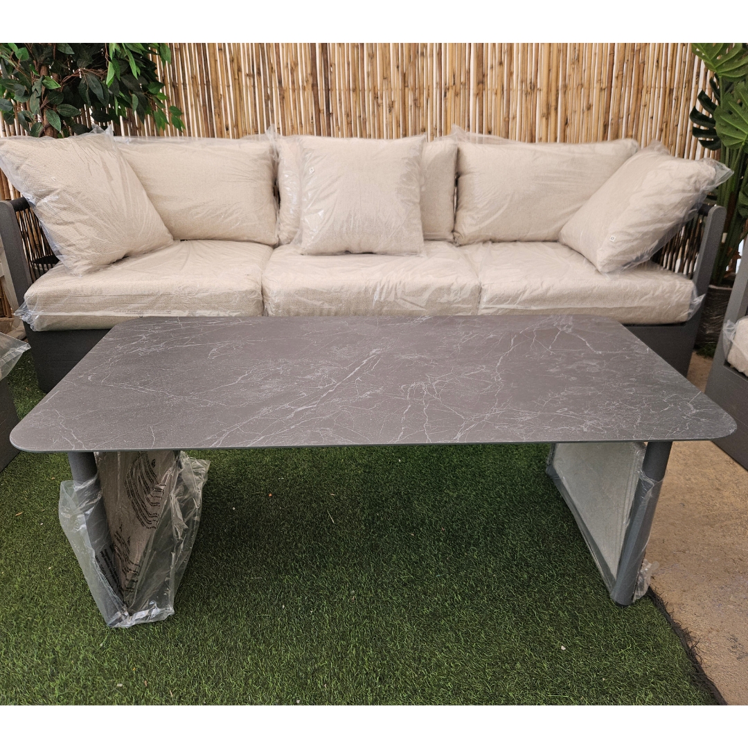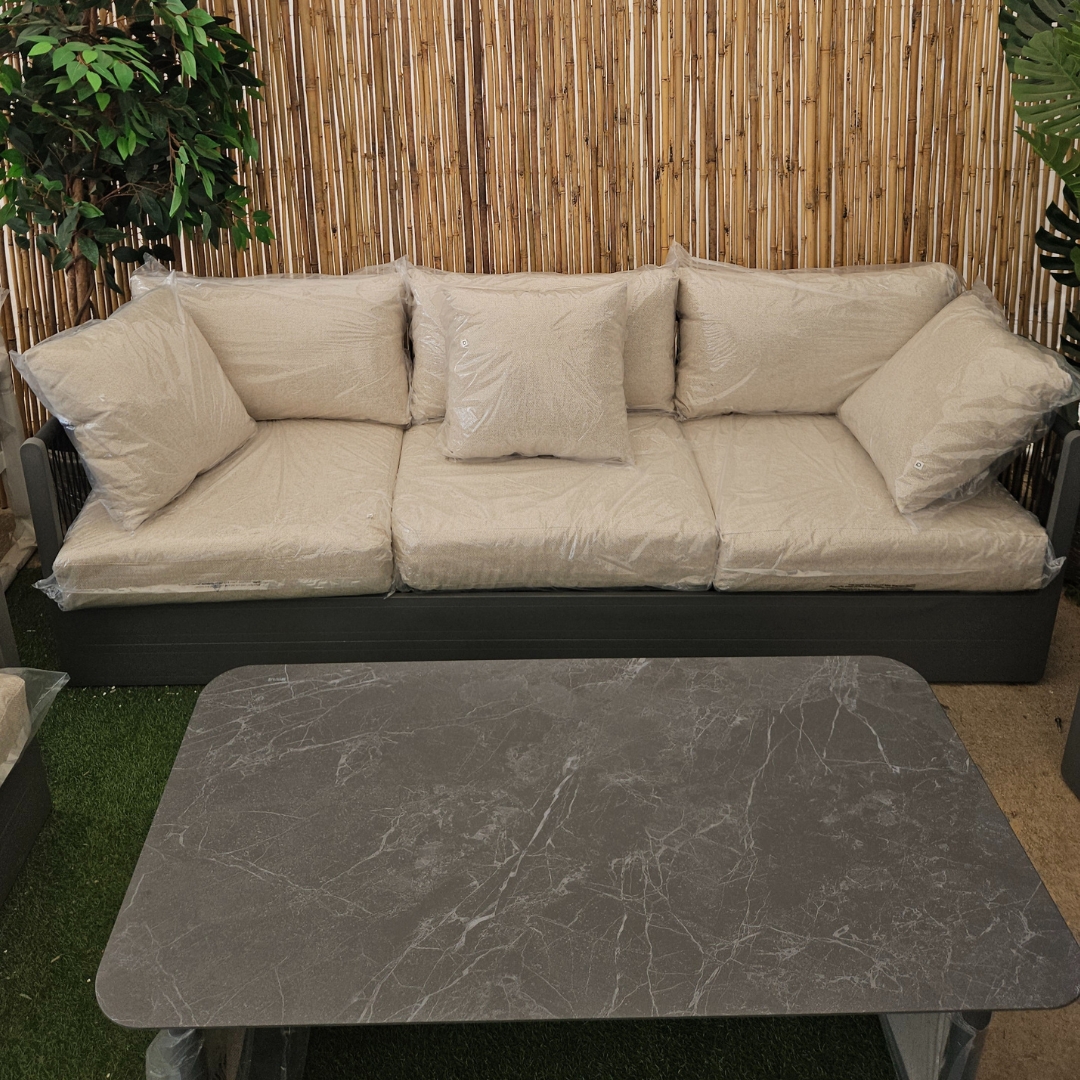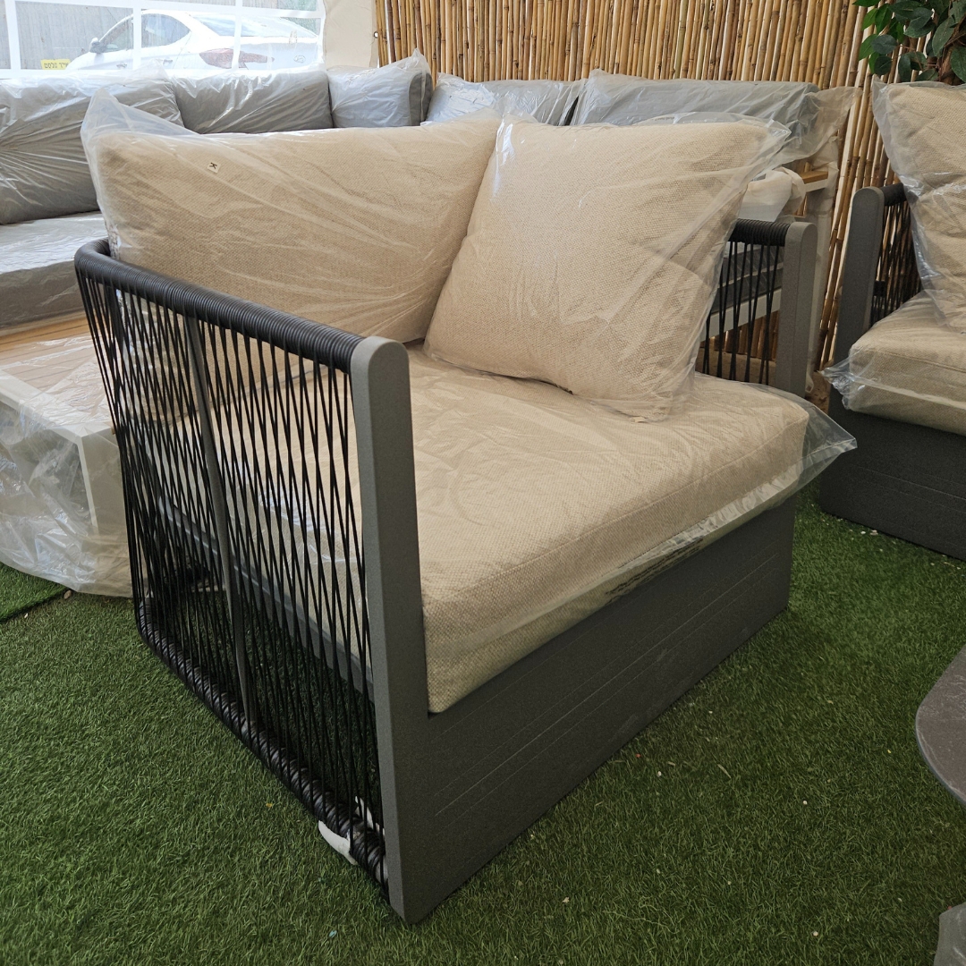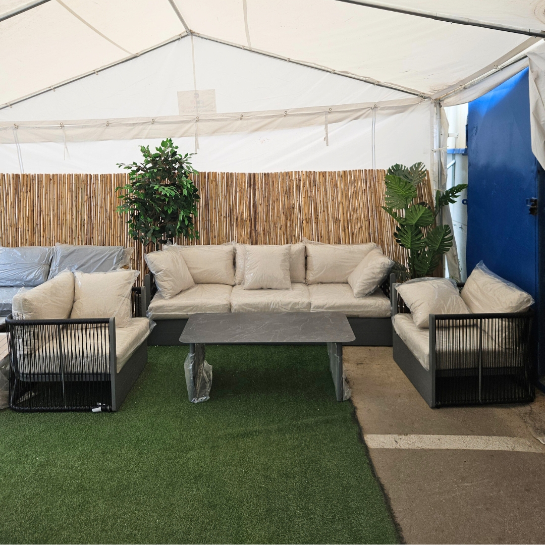 המערכת כוללת ספה תלת-מושבית מרווחת, שתי ספות יחיד ושולחן קפה אלגנטי, ומותאמת למרפסות, גינות, פטיו וחללים פנימיים כאחד.