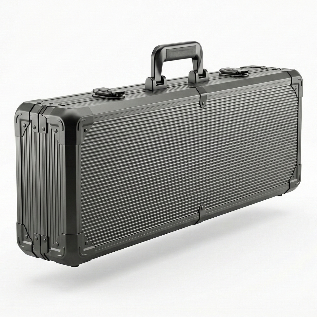 כל הרכיבים מאוחסנים במזוודת אלומיניום שחורה מהודרת ואיכותית, עם פינות מעוגלות, המיועדת לאחסון מסודר, נשיאה נוחה ושמירה על הציוד.